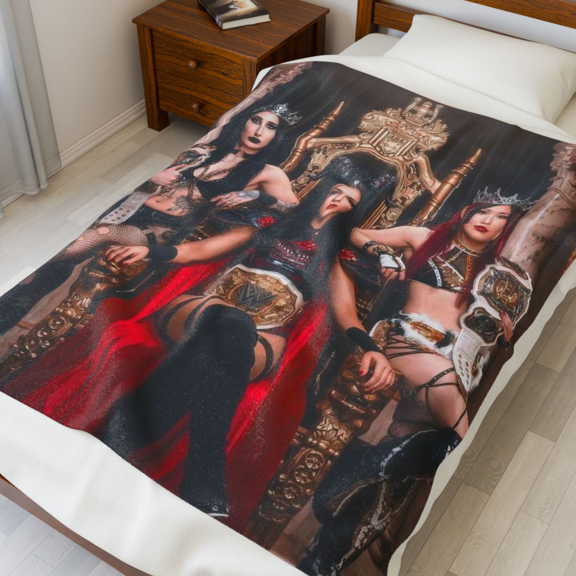 Sink into a scene of fierce sisterhood and cinematic drama. This velveteen plush blanket drapes like a throne-room cloak, its rich print capturing three warrior-queens posed on a gilded seat — crowns, championship belts, and confident stares framed by ornate columns. The fabric feels sumptuously soft against the skin, with enough weight to hold warmth without feeling bulky. Drape it over a couch during late-night movie marathons, lay it across a bed to sharpen a moody, gothic aesthetic, or bring it along to conventions and photoshoots as a statement wrap. The artwork’s high-detail, vibrant color comes through on one side only, so the imagery stays bold and sharp while the reverse remains plush and cozy. This blanket is made for adults who live for dramatic visuals, storytelling imagery, and tactile comfort — the companion that adds atmosphere to a room and presence to any scene.